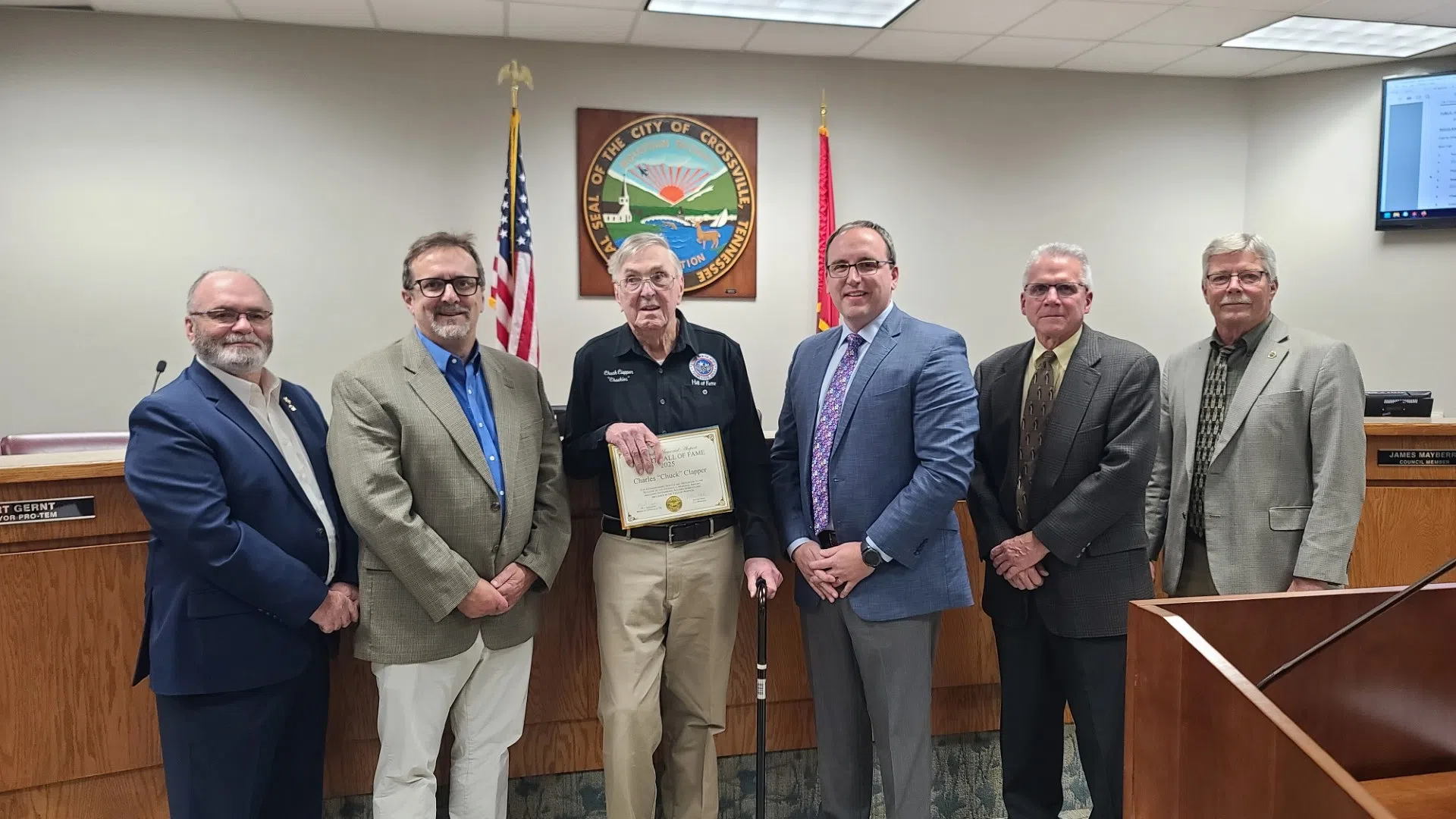 Charles “Chuck” Clapper is the latest addition to the Crossville Airport Hall of Fame. Mayor RJ Crawford recognized Clapper during the November session of the Crossville City Council on Tuesday. Clapper has been flying for more than 60 years and has logged in excess of 25,000 flying hours. Chuck was a key figure and charter member of the Crossville Civil Air Patrol Squadron created in 2014. (Pictured L-R: Councilmember Mike Turner, Mayor Pro-tem Art Gernt, Charles “Chuck” Clapper, Mayor RJ Crawford, Councilmember Mark Fox, MD and Councilmember James Mayberry)